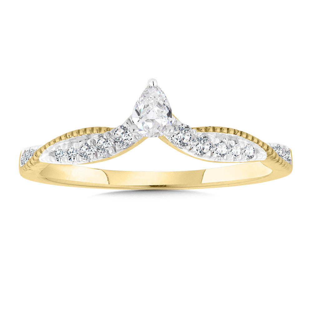 Celebrate the journey of your love with this stunning 14K yellow gold chevron anniversary band. At the heart of its graceful V-shaped design rests a captivating pear-shaped diamond center, symbolizing elegance and direction. Delicate milgrain beading and shimmering diamond accents twist down each side, creating a flowing, vintage-inspired look that highlights the ring’s gentle movement.
