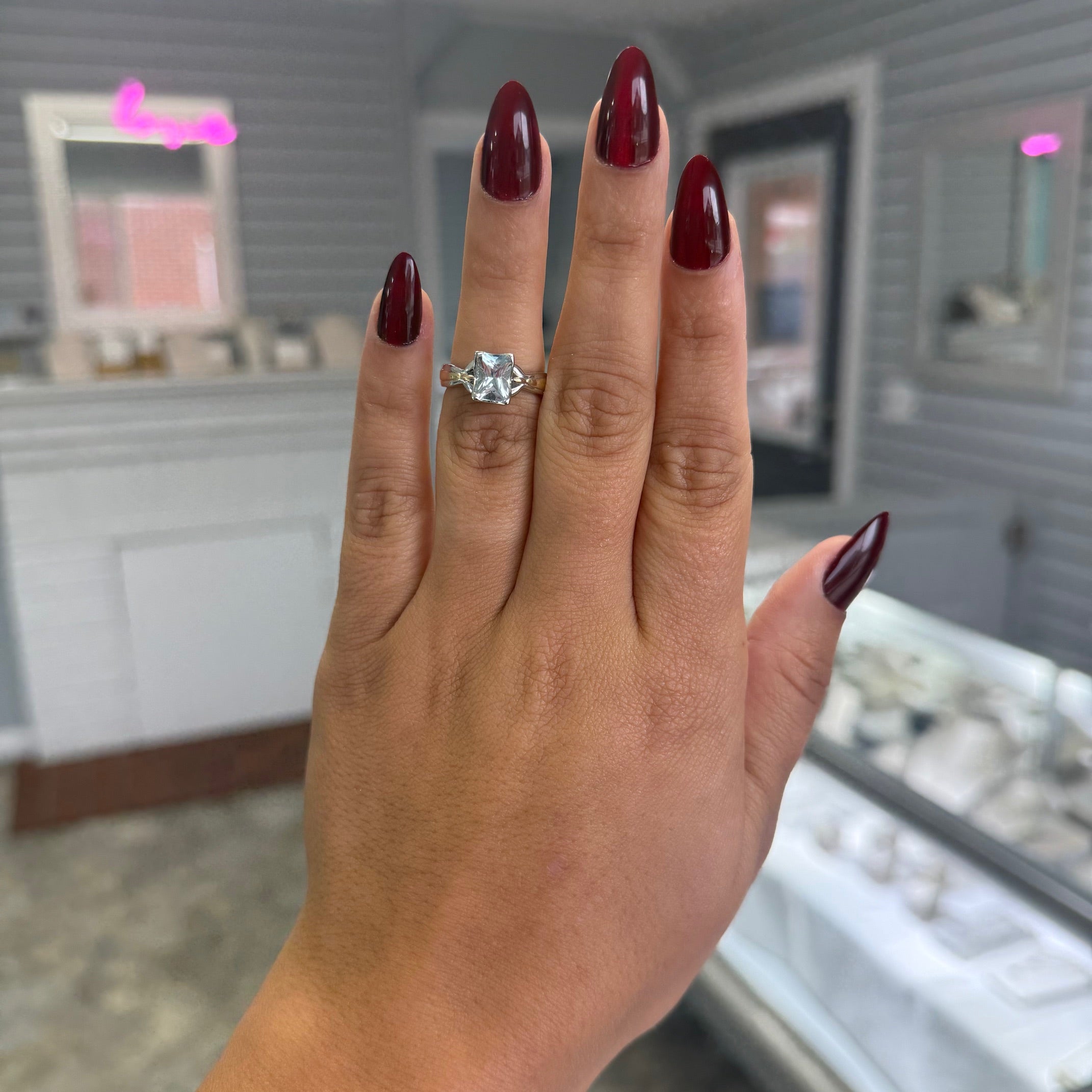 A striking blend of color and craftsmanship. This sterling silver ring features an 8x6mm oval aquamarine gemstone set at the center, accented by touches of 18K yellow gold for added warmth and contrast. The serene blue of aquamarine pairs beautifully with the two-tone metal design, creating a timeless and elegant look.