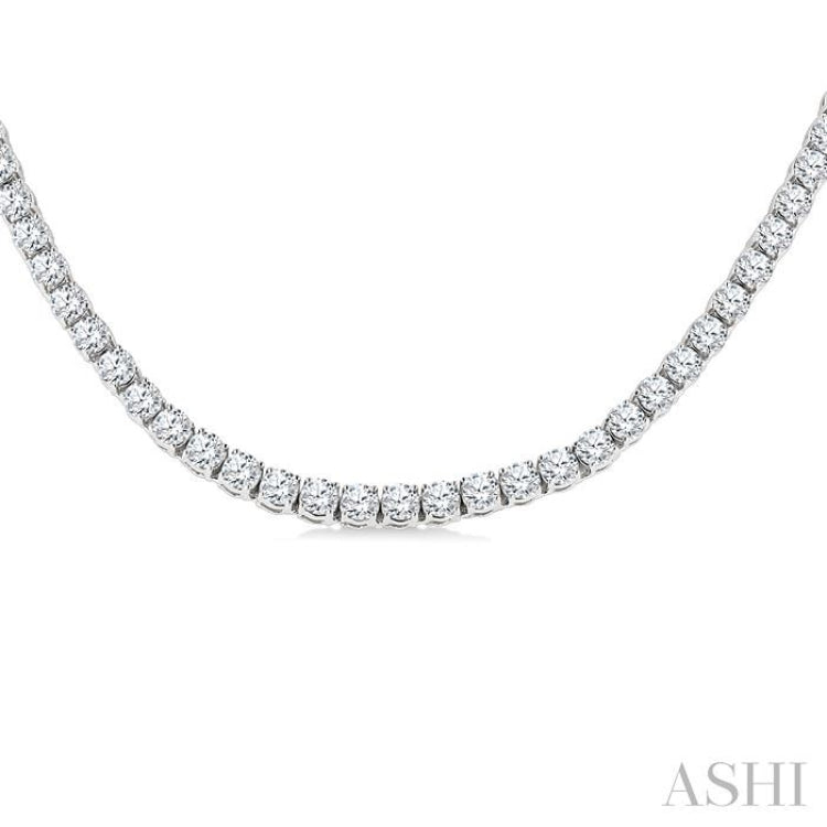 A brilliant display of continuous sparkle, this diamond tennis necklace features a close-knit row of prong set round cut diamonds, creating a seamless ribbon of light along the neckline. A total of 97 round cut diamonds grace the piece, each meticulously set to maximize brilliance. Styled in rhodium finish 14 karat white gold, the diamond tennis necklace exudes refined elegance. Total diamond weight is 20 Ctw.