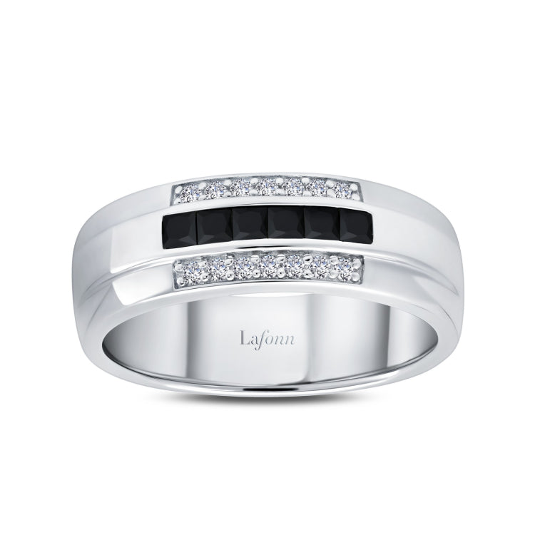 This classic men's ring features Lafonn's signature clear and black Lassaire simulated diamonds channel set in sterling silver bonded with platinum. The high polished finish completes this simple yet elegant look. Band Width: 6.65mm.