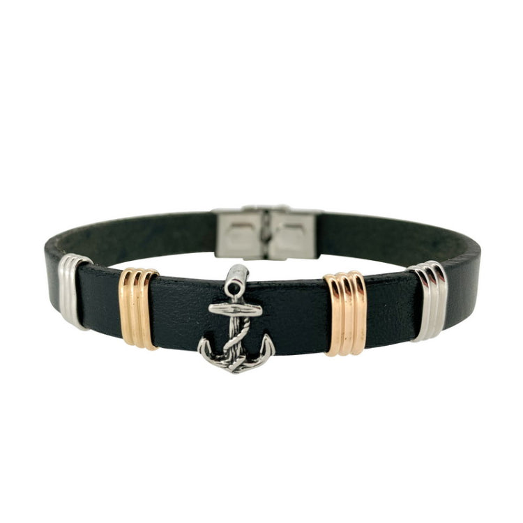 Black Leather 1 Cord Bracelet with Rose Gold IP Finish and Center Stainless Steel Anchor