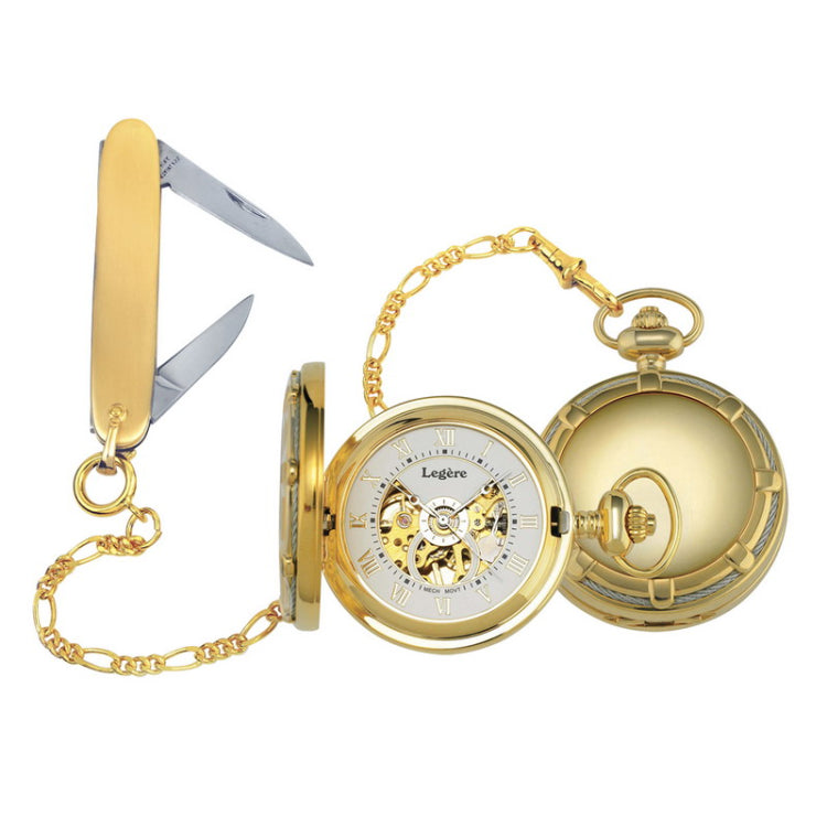 Gold Finish Large Pocket Watch Steel Cable Knife & Chain Set
