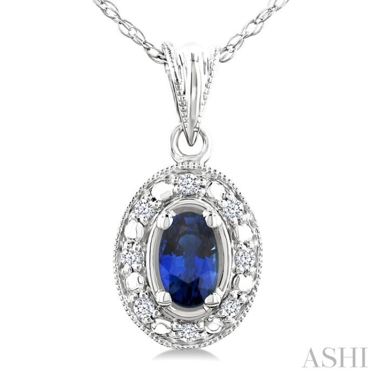 5x3 MM Oval Shape Sapphire and 1/20 Ctw Round Cut Diamond Pendant in 14K White Gold with Chain