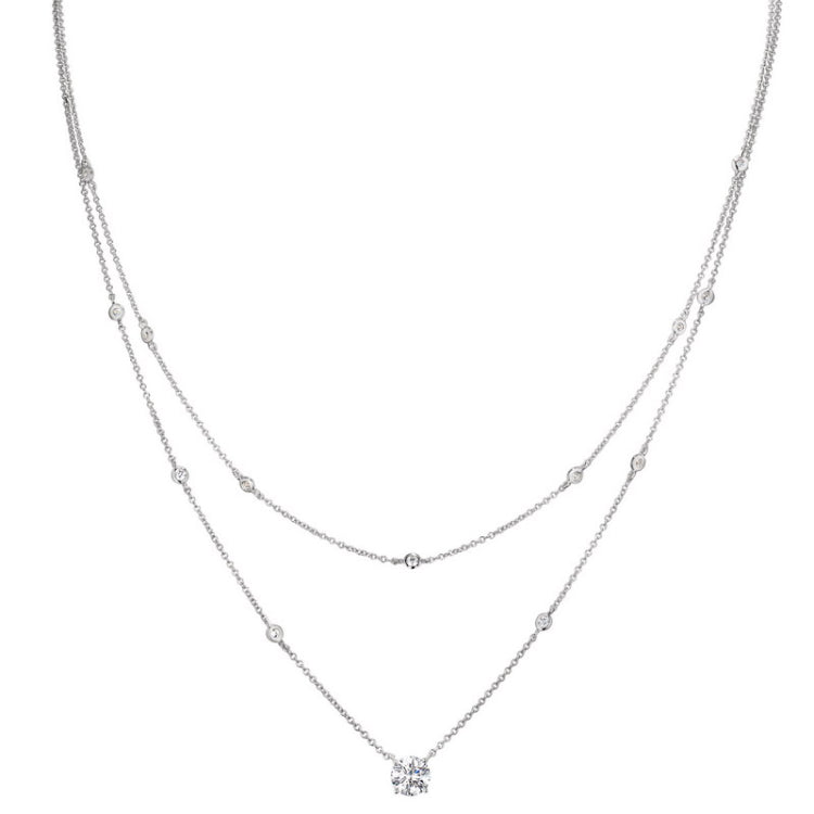 Platinum finish sterling silver micropave 2 chain layered necklace with small round bezel set simulated diamonds and one solitaire prong set simulated diamond on 16 - 18 adjustable chain