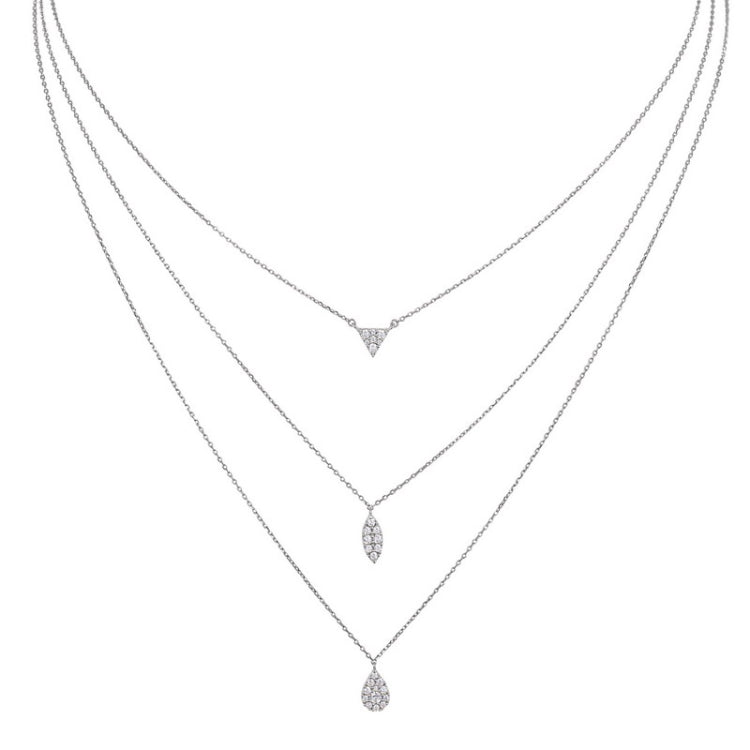 Platinum finish sterling silver micropave 3 chain layered necklace with simulated diamonds triangle, oval and tear drop on 16 - 18 adjustable chain