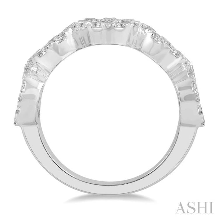 Magnificent, grand, beautiful, and lustrous are some of the words that describe the Lovebright collection, from which this awesome diamond ring hails. It features 5 circular mounts on the ring top, all of which are decorated with diamonds. There is a total of 45 invisible set round cut diamonds adorning the mounts, a 1/8 Ctw invisible set round cut diamond in the center and 8 smaller invisible set round cut diamonds encircling it, 9 diamonds each on the 5 mounts. The Lovebright diamond ring is crafted in a polished rhodium finish 14 karat white gold. Total diamond weight is 2 Ctw.